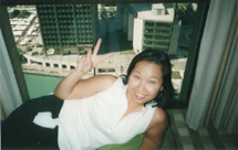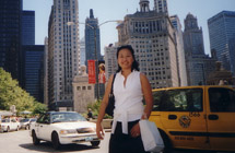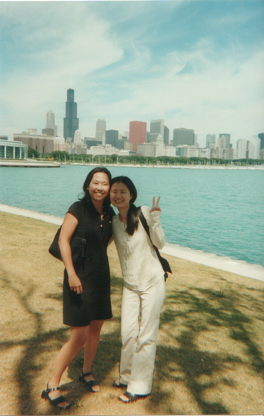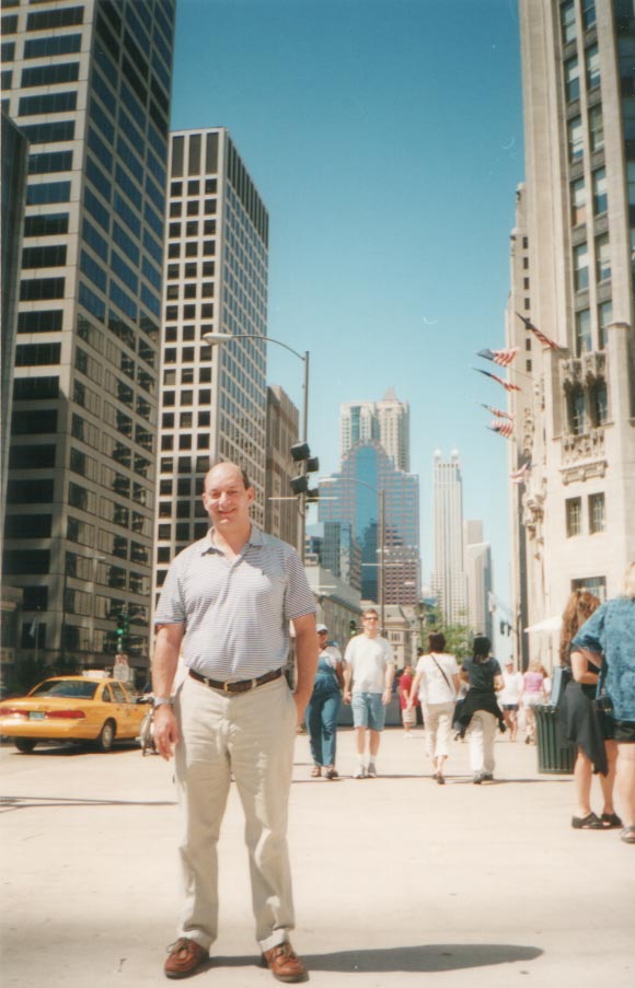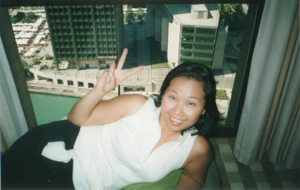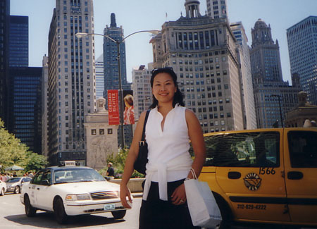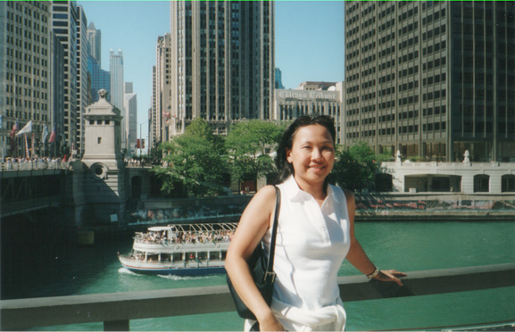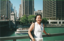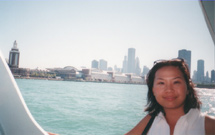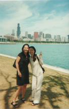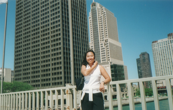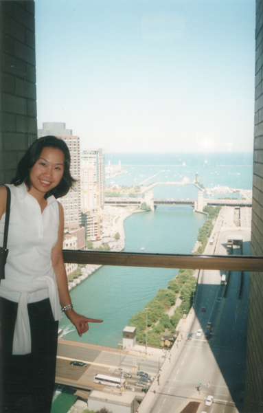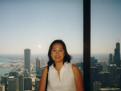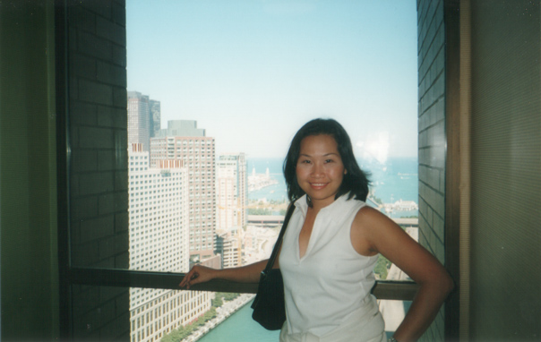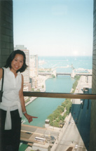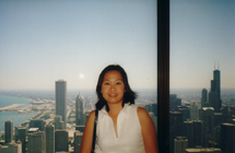 Patti poses in front of downtown Chicago, from restaurant in Hancock Tower